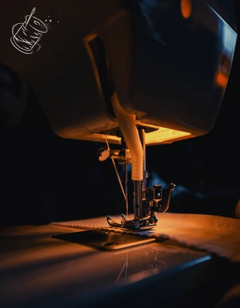 A close-up view of a precision sewing machine meticulously stitching a garment, symbolizing The Apparel Artist's dedication to craftsmanship and quality.